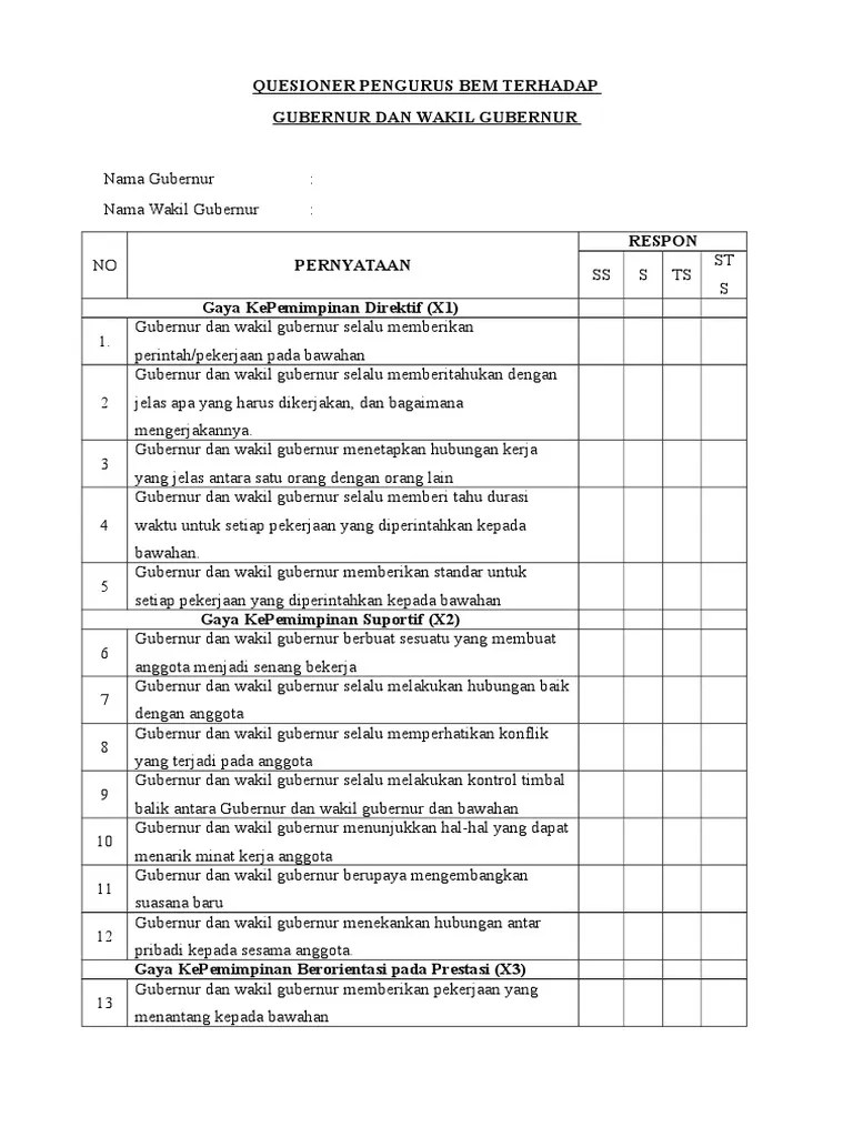 Persepsi pegawai terhadap kepemimpinan pertanyaan 1…………. Bapak edy john, se selaku branch manager pt galva technologies kantor. Pengaruh gaya kepemimpinan terhadap kinerja karyawan pt. Teknik yang digunakan dalam pengambilan datanya yaitu menggunakan teknik dokumentasi dan angket yang berupa sejumlah pernyataan dan pertanyaan tertulis yang . "pengaruh kepemimpinan dan komunikasi terhadap kinerja karyawan pada pt. Mungkin akan bermanfaat untuk menunjang gerak kinerja perusahaan dalam masa. Pengisiannya sama seperti pada kolom saat ini. Pada perusahaan adalah tentang gaya kepemimpinan yang diterapkan oleh atasan,. Data dikumpulkan melalui kuesioner yang dibagikan kepada 63 orang. Karena itu mohon kesediaan bapak/ibu untuk mengisi kuesioner dibawah ini. Sistem manajemen perusahaan selain motivasi kerja kepada para pegawai adalah. Satisfaction questionnaire,1967) untuk menilai kepuasan karyawan terhadap gaya. Selain itu penulis juga menggunakan kuesioner kepuasan kerja (minnesota.